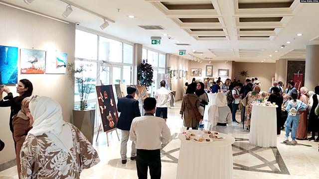 “Suriye’nin Afrin bölgesinden geldim Türkiye’ye. Şu anda, hem bu sergide tablom var, hem de serginin koordinatörlüğünü yapıyorum. Bu sergi, üçüncü uluslararası sergimiz. Bütün dünya koronavirüs ile zor bir süreç yaşıyor.