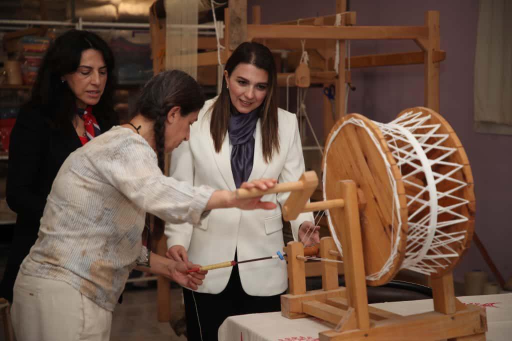 Esra Masatlı, Emel&Fikret Duman çiftinin sahibi olduğu Defne & Apollon İpekçilik üretim atölyelerini ziyaret ederek ipek böcekçiliğinin yemleme, koza üretimi ve ipek iplik elde etme gibi tüm aşamalarını geleneksel yöntemlerle gerçekleştiren işletmenin üretim sürecini yakından gözlemledi. Ziyaret sırasında işletme yetkililerinden detaylı bilgi alan Masatlı, Hatay’ın yeniden ayağa kalkma sürecinde şehrin değerlerinin korunarak geleceğe taşınmasının önemine dikkat çekti.