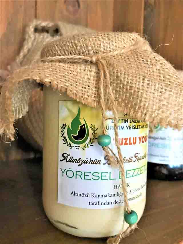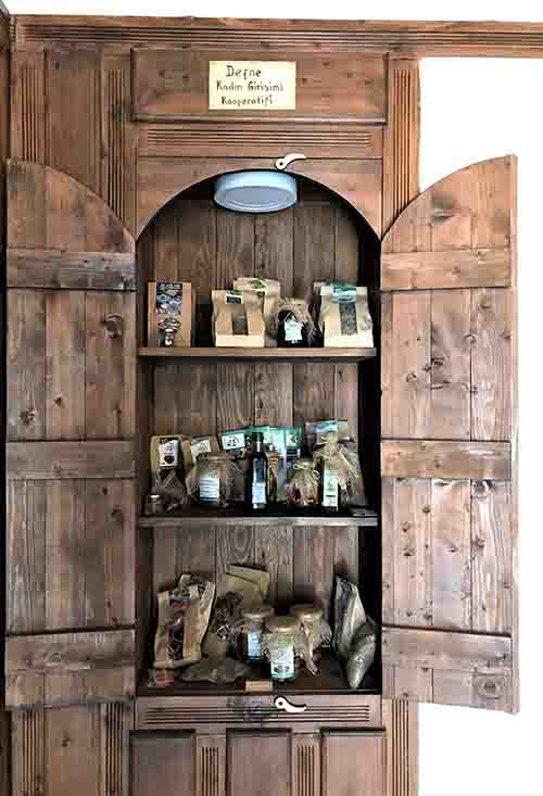 Gelen misafirleri, bu anlamda hazırlanan odalara davet eden görevlilerin işaret ettiği yerde dikkatinizi, kooperatif üretimleri çekiyor. Defne Kadın Girişimi Kooperatifi, Erzin Kadın Eli Kooperatifi ve diğerleri… Raflarda ise yöresel lezzetin ilk elden yapılan üretimleri sıralanıyor. Tuzlu Yoğurt, Nar Ekşisi ve akla gelebilecek diğer tüm üretimler.