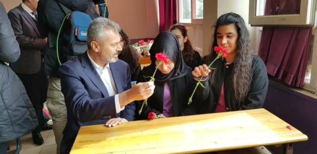 AK Partililer, terör mağduru Fatma’nın sınıfında bir süre oturdu, sıralarda yerlerini aldı, sohbet etti, öğrencilere çiçek verdi. -Cemil Yıldız-