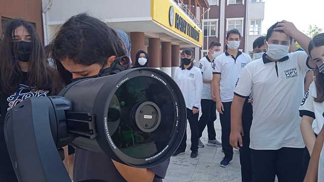Hatay Fen Lisesi öğrencileri, geçtiğimiz hafta sonunda okul bahçesinde kurulan teleskop üzerinden gökyüzü ile ilgili incelemede bulundu. Okul bahçesine çıkartılan öğrenciler tek tek teleskopa geldi ve “gökyüzü izleme bilim etkinliği” gerçekleştirildi. -Selvi Günay-