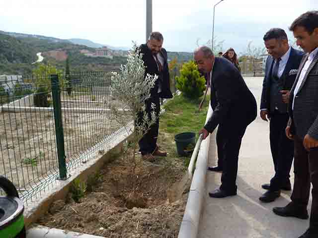 Defne Kaymakamı, gittiği okulun bahçesine zeytin ağacı dikti, suladı
