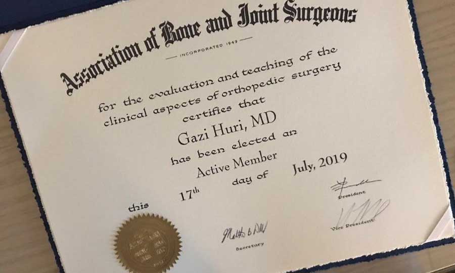 Ortopedi ve Travmatoloji Uuzmanı Dr. Gazi Huri, dünyada ortopediye yön veren ve en ünlü cerrahların olduğu Association of Bone and Joint Surgeons adlı derneğe kabul edildi. Dr. Huri, gelişmeyle ilgili olarak, “Dünya Cerrahları Derneği’ne kabulüm çok değerli. Mentorum, Johns Hopkins Üniversitesi Ortopedi ve Travmatoloji Anabilim Dalı Başkanı Prof. McFarland’ın muhteşem sunumu ile gerçekleşti” dedi.