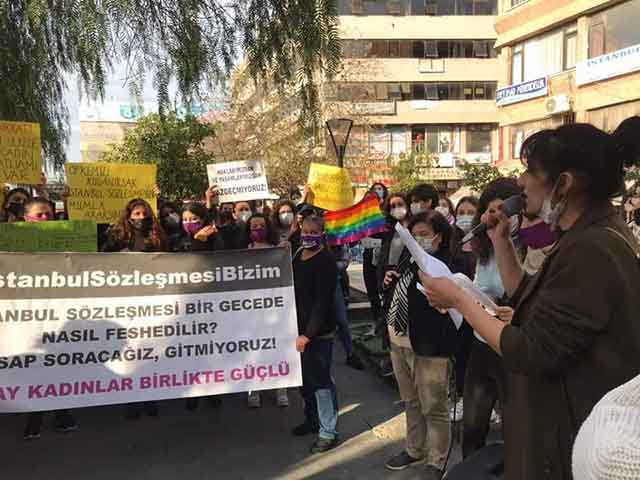 Bizler; kadın, LGBTİ+, çocuk düşmanı söylem ve politikalarla devletin tüm kurumlarına sirayet etmiş erk egemen zihniyetinizin tam karşısındayız. İstanbul Sözleşmesi biz kadınlara bahşedilmiş bir hak değil mücadelemizle kazanmış olduğumuz hakkımızdır. Bizim mücadelemiz ve kararımızla nasıl imzalandıysa şimdi yine aynı kararlılıkla, barikatlarınızı, yasaklarınızı nasıl yıktıysak, irademizi yok sayarak İstanbul Sözleşmesinden çekilme kararınızın karşısında durmaya, haklarımızı ve hayatımızı savunmaya devam edeceğiz. Biz İstanbul Sözleşmesi uygulansın kadınlar yaşasın derken bir gece yarısı kararıyla yaşamımıza kast edilmesini kabul etmiyoruz. Haklarımızdan ve hayatlarımızdan vazgeçmiyoruz.”