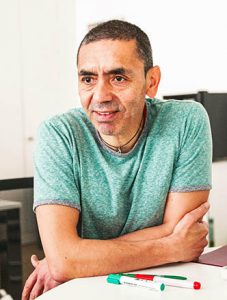 Dünyanın önde gelen bağışıklık uzmanları arasında yer alıyor ve insan vücudu, kendi silahlarıyla kanseri yenene kadar ona rahat yok. Firmaları BioNTech, şu anda Lufthansa’nın dört katı değerli olmasına ve onları milyoner yapmasına rağmen, kızlarıyla birlikte, firmanın yakınlarındaki küçük bir dairede yaşıyorlar halen. Otomobilleri yok ve işe bisikletle gidip, geliyorlar. Çocukken, yaşamını Tanrı‘ya adamak istiyordu, ama sonunda bilime adadı. Balayında bile laboratuarlarında çalışmaya devam ediyordu.” -Tamer Yazar-