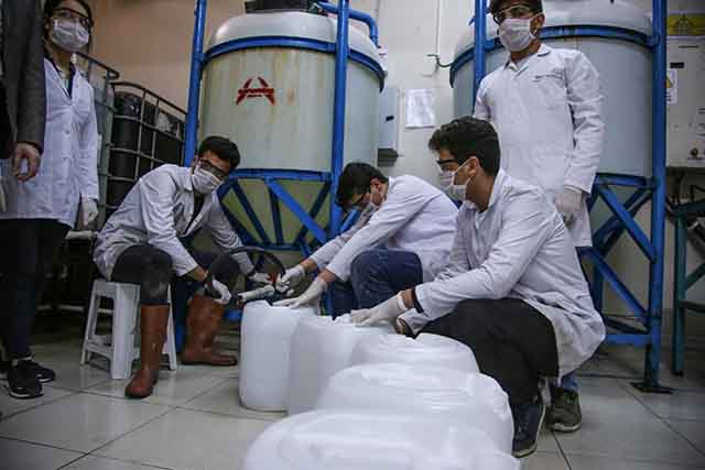Antakya Şehit Ahmet Benli Mesleki ve Teknik Anadolu Lisesi öğrencileri, okulların temizliğinde kullanılmak üzere günlük 10 ton yüzey dezenfektanı üretiyor.
