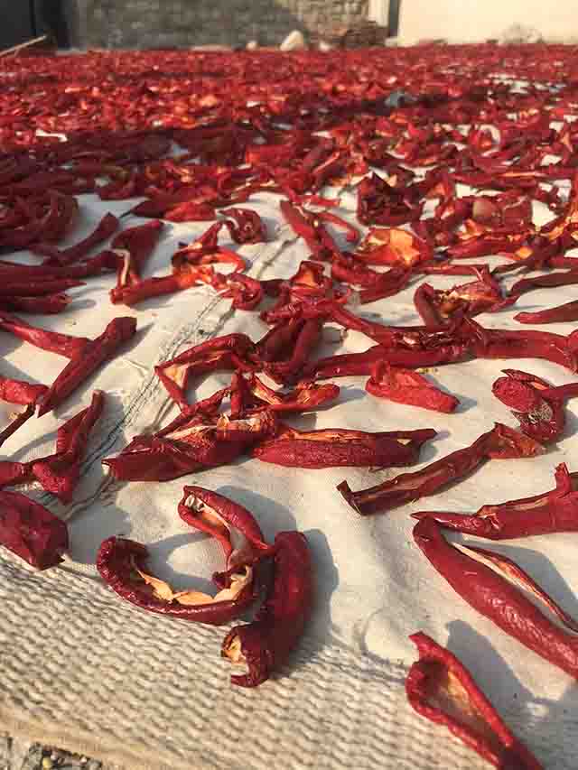 özenle yerlere diziliyor. Kimi damında, kimi de evinin önünde yapıyor bu işlemi. Birçok evin balkonuna, duvarına ve çatısına asılarak kurutulan kırmızı biberlerin oluşturduğu görüntüyü de unutmamak gerek tabi.