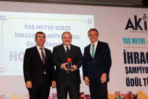 Konuşmaların ardından; Hatay, Adana ve Mersin illerinde Akdeniz Yaş Meyve ve Sebze İhracatçıları Birliği’nde en fazla ihracat yapan üye firmalara, ihracat performanslarına göre ödülleri verildi. Firmalar, ödüllerini, Sanayi ve Teknoloji Bakanı Mustafa Varank ile AK Parti Genel Başkan Yardımcısı Lütfi Elvan’ın elinden aldı. -Tamer Yazar-