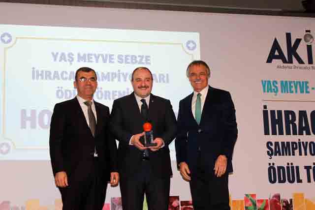 Bakan Varank, yaş meyve sebze ihracat verilerini de değerlendirerek, “İlk 11 ayda ulaşılan rakam 2 milyar dolar ve geçtiğimiz seneye göre yüzde 9’luk bir artışa tekabül ediyor. AKİB üyeleri tek başına bu 2 milyar doların yüzde 47’sini gerçekleştiriyor. Gerçekten çok büyük bir başarı ve bugün aramızda bulunan 45 firma bu başarının mimarları” dedi ve ödül alan tüm firmaları tebrik etti.