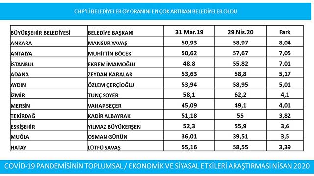 Araştırmaya göre, 31 Mart 2019 yerel seçimlerinde yüzde 50,93 oy alarak Ankara Büyükşehir Belediye Başkanlığı’na seçilen Mansur Yavaş’ın, 29 Nisan 2020 tarihi itibariyle oyunu yüzde 58,97’ye yükselttiği ve büyükşehir belediye başkanları arasında “yüzde 8,04” ile oyunu en fazla artıran belediye başkanı olduğu dile getirildi.