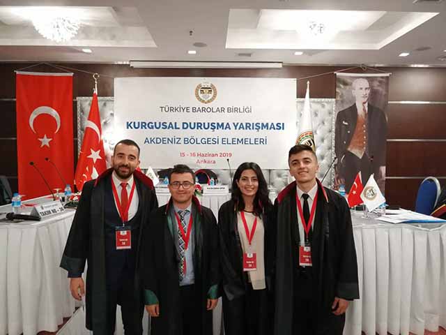 Ankara’daki, Türkiye Barolar Birliği Kurgusal Duruşma Yarışması Akdeniz Bölge elemelerinde, Hatay Barosu’nu temsil eden Stj. Av. Hüseyin Küskü, Stj.Av.İbrahim Gelen, Stj.Av. Merve İnan ve Stj.Av.Mehmet Can Dönmezer’den oluşan takım bölge üçüncüsü oldu.-Selvi Günay-