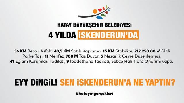 Sosyal medya üzerinden “Hatay’ın Gerçekleri” imzasıyla Hatay Büyükşehir Belediyesi’nin hizmetleri anlatılırken, AKP ve MHP’ye mensup 12 ilçe belediyesinin ise hangi hizmetleri yaptıkları soruluyor. 24 Haziran seçimlerinin yaklaştığı bu günlerde, ilimiz yerel siyasetinde tartışmalara yol açması beklenen Ali Gezgin imzalı sosyal medya paylaşımlarından birkaçı şöyle: