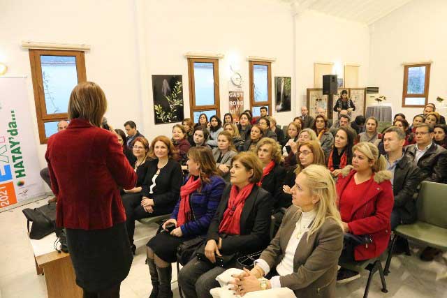 Hatay Büyükşehir Belediyesi ve Defne Kent Konseyi’nin Defne Evi’nde ortaklaşa düzenlediği toplantıya; Prof. Dr. Nazan Savaş, HBB Başkan Danışmanı Ömer Faruk Çelebi, Defne Belediye Başkanı eşi Meryem Ay Yaman, Hatay Kadın Girişimciler Derneği (KAGİD) üyeleri, Defne Kent Konseyi Kadın Meclis Yürütme Kurulu Başkanı Gülnaz Habib ile Kurul üyeleri ve çok sayıda vatandaş katıldı.