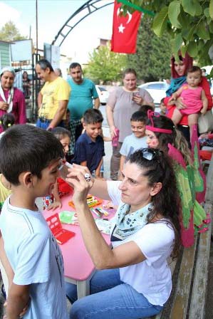HBB Şehir Tiyatrosu etkinliğinde minikler güzel vakit geçirirken, palyaçolar ile birlikte doğal boyalarla yüzlerini renklendirerek gönüllerince dans edip eğlenme fırsatı buldular. -Selvi Günay-