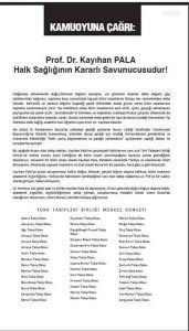 Korona salgınının başından beri yaptığı açıklamalar nedeniyle hakkında soruşturma açılan Halk Sağlığı Uzmanı Prof. Dr. Kayıhan Pala için, Hatay ve diğer illerdeki Tabip Odaları harekete geçti, ortak bir bildiriye imza attı.