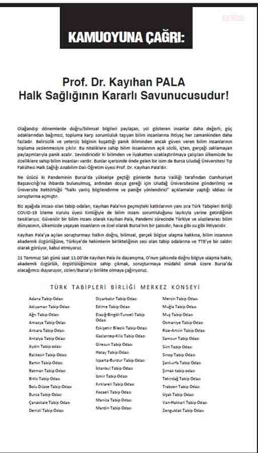 Bursa’da yerel bir gazeteye pandemiyle ilgili verdiği röportaj nedeniyle hakkında soruşturma başlatılan, Bursa Uludağ Üniversitesi Tıp Fakültesi Halk Sağlığı Anabilim Dalı Öğretim üyesi ve Türk Tabipleri Birliği Covid-19 İzleme Kurulu üyesi Prof. Dr. Kayıhan Pala için, aralarından Hatay’ın da yer aldığı 44 kentin Tabip Odası tarafından ortak bir ilan yayınlandı.
