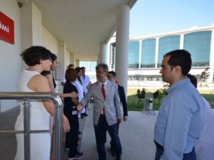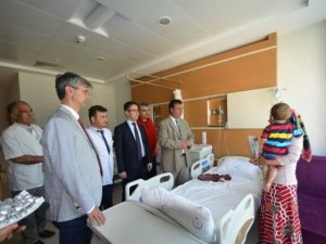 Hatay Devlet Hastanesi’ne sürpriz bir ziyarette bulunan Vali Yardımcısı ile kurum yöneticileri, hastalara çiçek takdim etti. Hatay Vali Yardımcısı Bilal Ölmez, İl Sağlık Müdürü Dr. Ümit Mutlu Tiryaki ve Hatay Kamu Hastaneleri Genel Sekreteri Dr. Sebahattin Yılmaz, birlikte Hatay Devlet Hastanesi’ni ziyaret etti. Heyet, hastalara geçmiş olsun ve acil şifa dileğinde bulundu, çiçek takdim etti. -Cemil Yıldız-