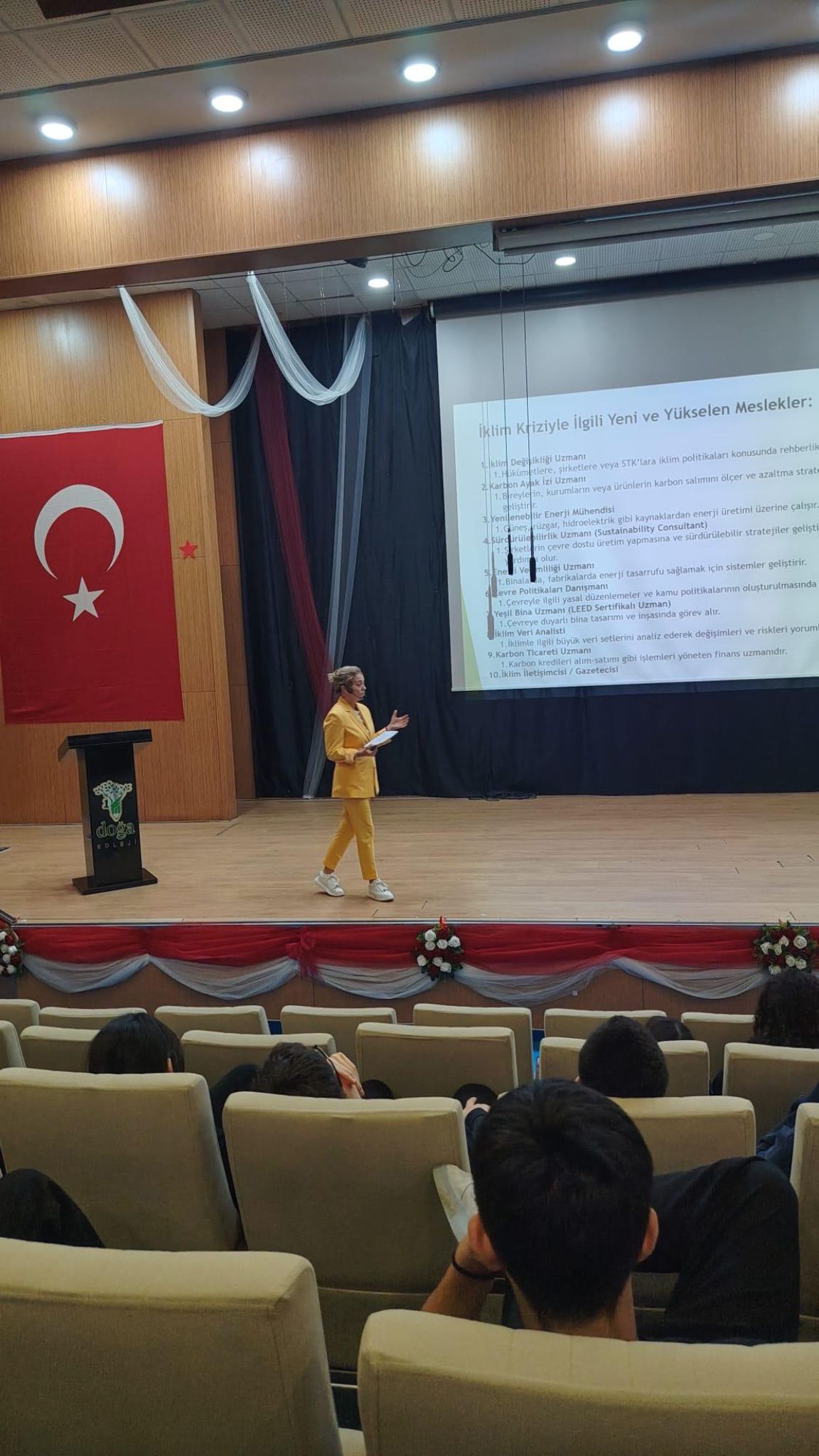 Okulda gerçekleştirilen etkinlikte öğrencilerle bir araya gelen Mıstıkoğlu, iklim krizinin yalnızca çevresel bir sorun olmadığını, aynı zamanda yeni iş alanları ve mesleklerin ortaya çıkmasına neden olan büyük bir dönüşüm süreci olduğunu anlattı.