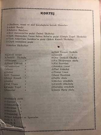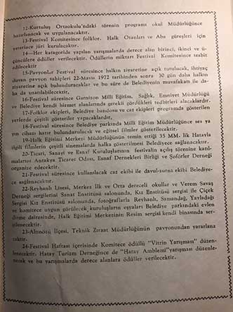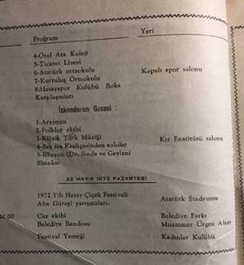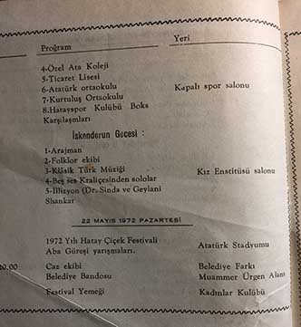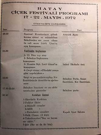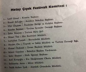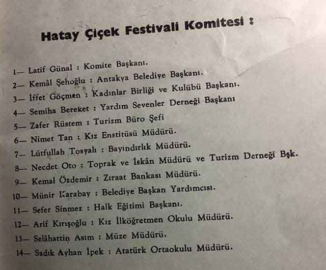 Çiçek Festivali’nin davetiyesinde, 14 kişilik festival düzenleme komitesinin tek tek isimleri var. Komite Başkanı ne Sayın Hatay Valisi Lütfü Uraz, ne de Antakya Belediye Başkanı Sayın Kemal Şeyhoğlu! Komite Başkanı, o zamanlar Gazipaşa İlkokulu’nun Müdürü olan Sayın Latif Günal’dı. Çok ilginç değil mi ? Şimdiki devlet yönetim anlayışından çok farklı. Hiyerarşik olarak, bir ilkokul müdürünün, kamu oyunu ilgilendiren çalışmalara öncülük etmesi bana çok ilginç geldi.