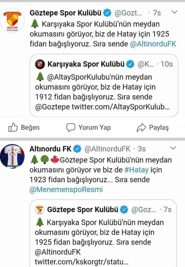 Altay Spor Kulübü, sosyal medyadan bir kampanya başlatarak, “Hatay için el ele! Yangında zarar gören ormanlarımızı yeşertmek için 1914 fidanla Karşıyaka Spor Kulübü’ne meydan okuyoruz” mesajını paylaştı. Bu mesajın üzerine Karşıyaka Spor Kulübü de, “Altay Spor Kulübü’nün meydan okumasını görüyor, biz de Hatay için 1912 fidan bağışlıyoruz. Sıra sende Göztepe” yanıtını verdi. Karşıyaka’nın mesajına alıntılayan Göztepe Spor Kulübü ise, “Biz de Hatay için 1925 fidan bağışlıyoruz, sıra sende Altınordu” diyerek pası Altınordu’ya attı.