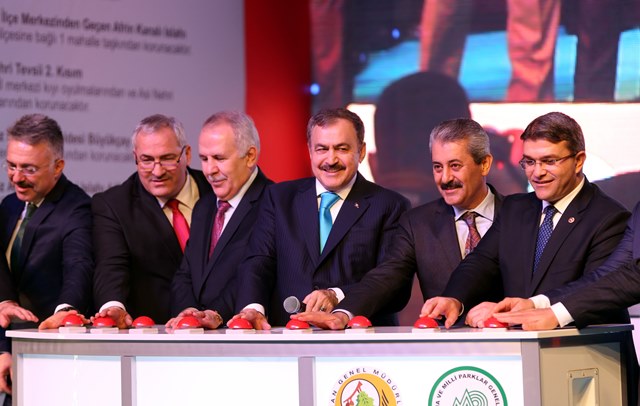 Konuşmasından Hatay için büyük bir seferberlik yapacaklarını vurgulayan Bakan Eroğlu, “9 müjde 178 milyon TL ile DSİ. İkincisi orman teşkilatımız, 11 milyon TL. Bu yıl ORKÖY desteği yapılacak. Gelir getirici ceviz, badem, defne, başka ne varsa bunlar tespit edilecek. Bunların üç yıl bakımı, dikimi, bütün masraflar bize ait, geliri 49 yıl vatandaşlara ait olacak. Orman teşkilatının 5 müjdesi var. Bu yıl 5 bin 820 dekar arazide çalışma yaparak yaklaşık 1,5 milyon fidan dikilecek. Bu yıl burada ayrıca 5.7 milyon fidan üreteceğiz. Ayrıca bu yıl 2 mesire yeri kuracağız. Daha önce verdiğimiz 57 müjdeden 36’sını tamamladık. Diğerlerinin de çoğu başladı. 2016 sonunda verdiğimiz 57 müjdenin çoğunu bitireceğiz.”