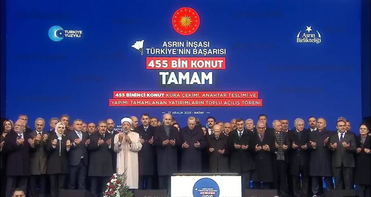 Hatay’da düzenlenen 455 Bininci Afet Konutu Kura Çekimi, Anahtar Teslimi ve Yapımı Tamamlanan Yatırımların Toplu Açılış Töreninde kura çekimi dualarla başladı. Deprem felaketinden en ağır etkilenen illerin başında gelen Hatay’da, binlerce aile için kalıcı yuvalara kavuşmanın heyecanı yaşanıyor. Kura Törenini AFAD Hak Sahipleri Kura Çekimi 1 isimli Youtube kanalından canlı izleyebilirsiniz.