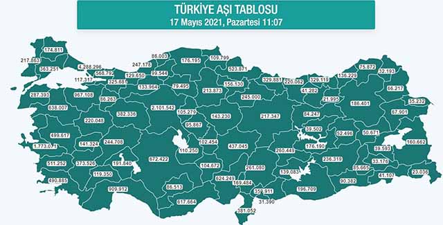 Verilere göre; İstanbul’da uygulanan birinci doz aşı sayısı 2 milyon 538 bin 159, ikinci doz aşı sayısı 1 milyon 726 bin 435 toplamda 4 milyon 264 bin 594, Ankara’da birinci doz aşı sayısı 1 milyon 211 bin 912, ikinci doz aşı sayısı 876 bin 781 toplamda 2 milyon 88 bin 693, İzmir’de ise birinci doz aşı sayısı 1 milyon 14 bin 888, ikinci doz aşı sayısı 749 bin 931 toplamda 1 milyon 764 bin 819 doz olarak kayıtlara geçti.