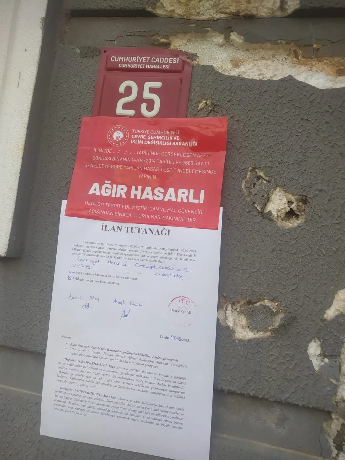 Vatandaşlar, ellerindeki resmî belgeler ve çarpıcı fotoğraflarla binanın durumunu ortaya koymaya çalışıyor. Apartmanın girişine asılan ağır hasarlı ilanı, Hatay Valiliği ve ilgili müdürlükler tarafından imzalanmış durumda. Ancak aynı apartman bazı listelerde “az hasarlı” olarak yer alıyor. Bu çelişki büyük kafa karışıklığı yaratıyor.