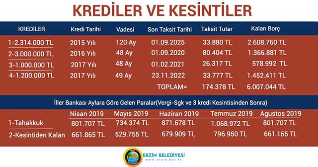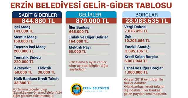 Erzin Belediye Başkanı Ökkeş Elmasoğlu, belediyenin gelir-giderleri ile borç cetvelini yayınladı. Aylık geliri 879 bin lira, gideri 845 bin lira olan Erzin Belediyesi’nin geçmiş dönemden kalma 29 Milyon TL borcu bulunuyor.