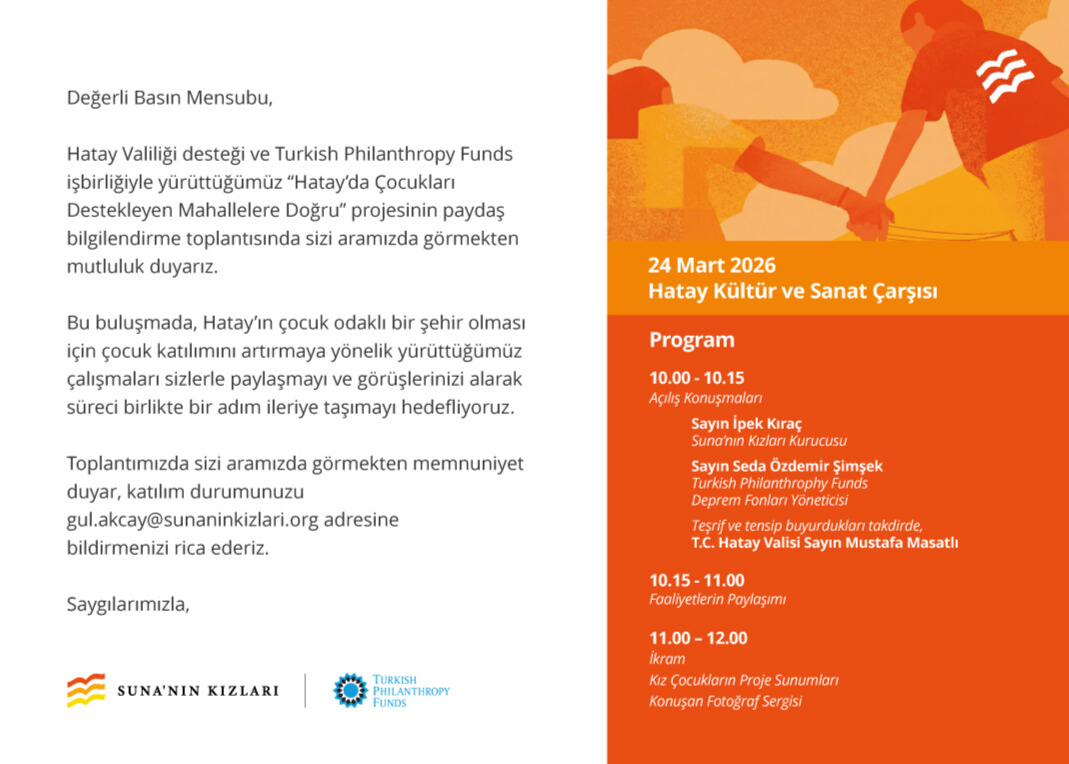 Hatay Valiliği desteği ve Turkish Philanthropy Funds iş birliğiyle yürütülen “Hatay’da Çocukları Destekleyen Mahallelere Doğru” projesinin bilgilendirme toplantısı 24 Mart Salı günü gerçekleştirilecek.