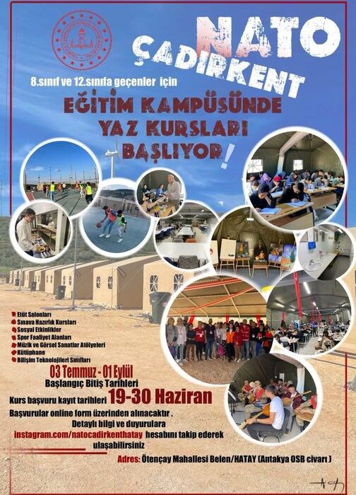 Hatay İl Milli Eğitim müdürlüğü yetkilileri, kursların NATO Çadır Kent Eğitim Kampüsünde verileceğini bildirdi. Nato çadırkent Antakya-Belen arasındaki OSB’de bulunuyor.