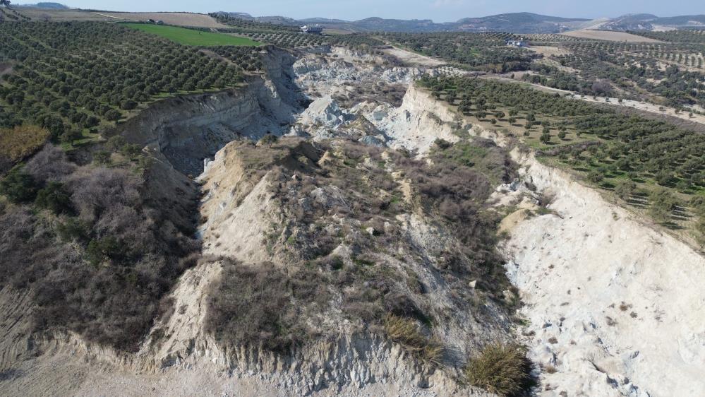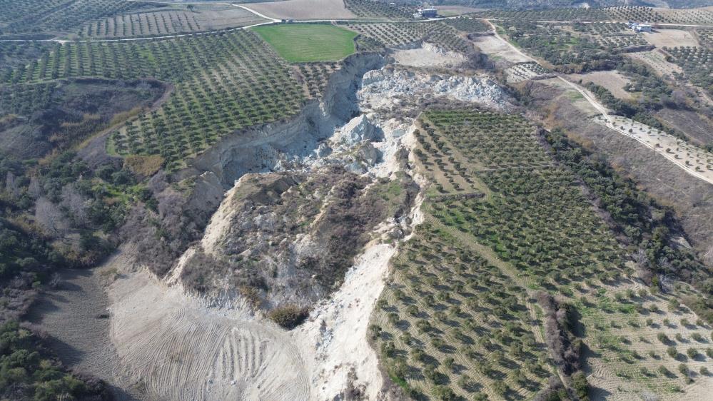 6 Şubat depremlerinin ardından Tepehan Mahallesi’nde bulunan 33 dönümlük zeytinlik, fay kırılması sonucu ikiye bölündü. Yaklaşık 300 metre genişliğe ulaşan devasa yarık, 200 ağacı içine çekerek bahçenin önemli bir kısmını kullanılamaz hale getirdi. Bölge halkı, felaketin izlerini taşıyan bu görüntünün kendilerine o korku dolu anları yeniden yaşattığını belirtiyor.