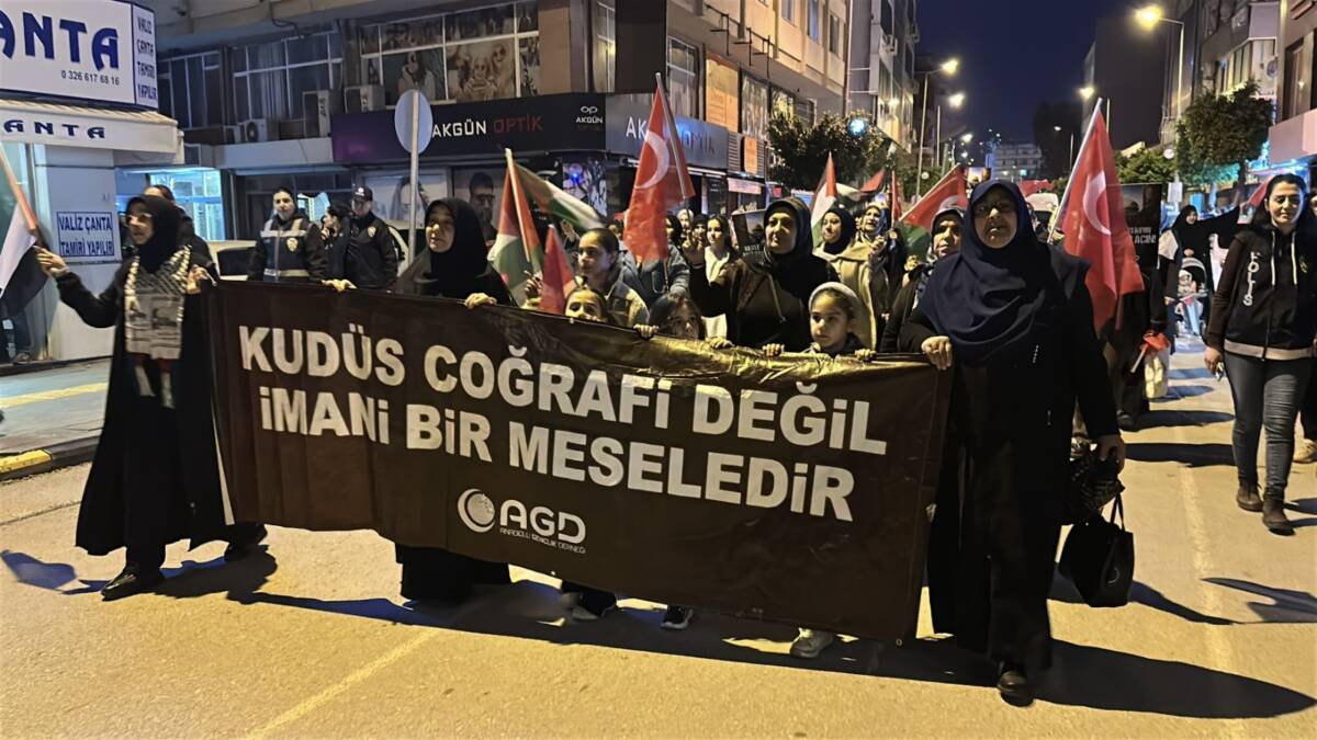 Anadolu Gençlik Derneği (AGD) Hatay Şubesi tarafından organize edilen yürüyüş, Fatih Camisi önünden başladı. Türk ve Filistin bayrakları taşıyan kalabalık grup, ellerinde dövizlerle İsrail aleyhine sloganlar atarak Kaptan Mehmet Paşa Camisi’ne kadar yürüdü.