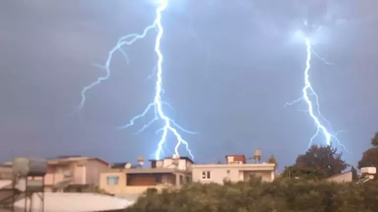 Vatandaşlar tarafından paylaşılan videolarda, Hatay semalarını saran yıldırımların gökyüzünü tamamen kapladığı ve Antakya merkezinde adeta gündüz aydınlığının oluştuğu görüldü.