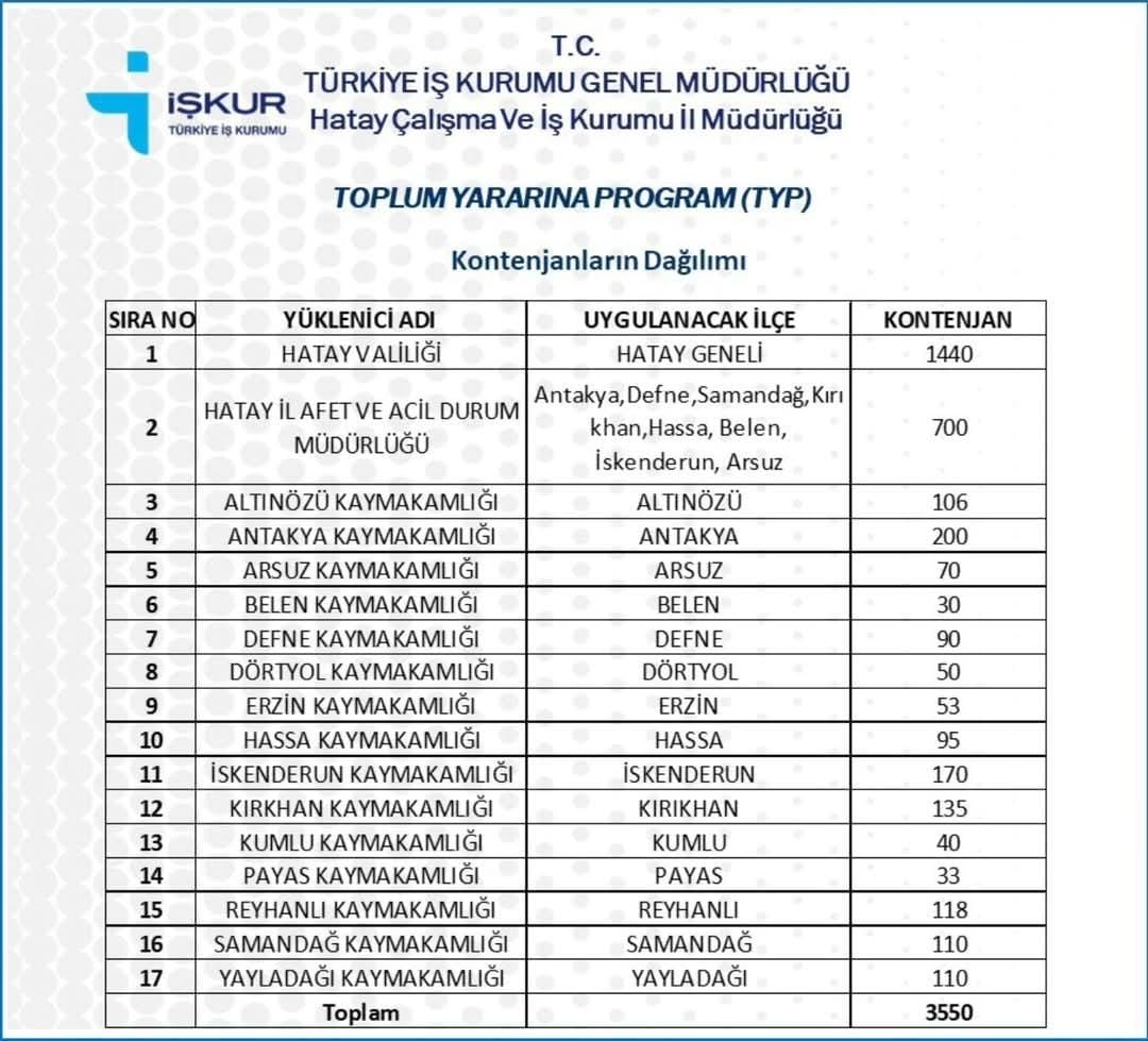 Hatay Valiliği koordinesinde, bağlı kaymakamlıklar ile Hatay İl Afet ve Acil Durum Müdürlüğü (AFAD) iş birliğinde Toplum Yararına Program (TYP) kapsamında toplam 3 bin 550 kişiye geçici süreli istihdam sağlanacak.