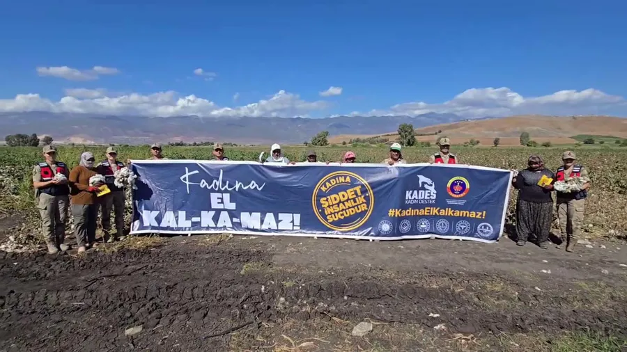 Pamuk tarlasında emek veren kadınlarla sohbet eden jandarma personeli, onlarla birlikte pamuk toplayarak farkındalık etkinliği düzenledi. “Kadına şiddet insanlık suçudur, kadına el kalkamaz” mesajıyla gerçekleştirilen etkinlikte, Kadın Acil Destek (KADES) uygulamasının nasıl kullanılacağı anlatıldı.