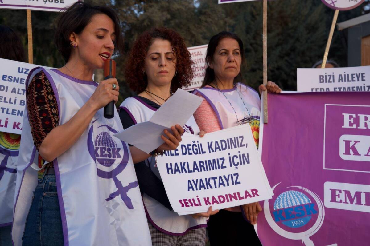 MEMUR-SEN’in “Aile Yılı” kapsamında anayasal düzenleme önerisine de tepki gösteren KESK’li kadınlar, LGBTİ+ bireylere yönelik nefret söylemlerinin bu tür politikalarla desteklendiğini savundu.