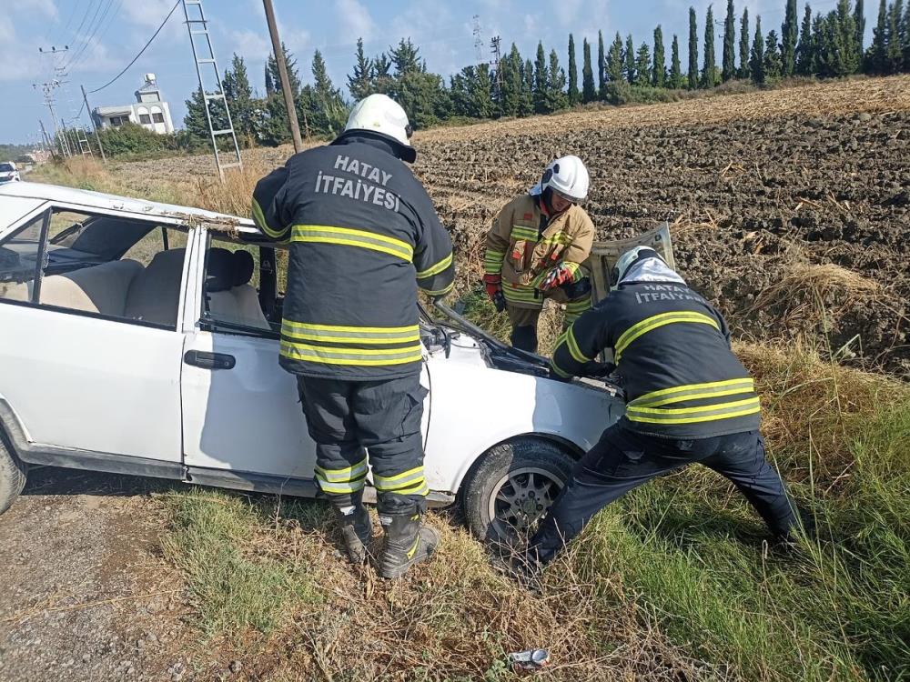 Hatay’ın Arsuz ilçesi Üçgüllük Mahallesi’nde meydana gelen trafik kazasında, sürücüsünün direksiyon hakimiyetini kaybettiği TOFAŞ marka otomobil takla atarak ters döndü.