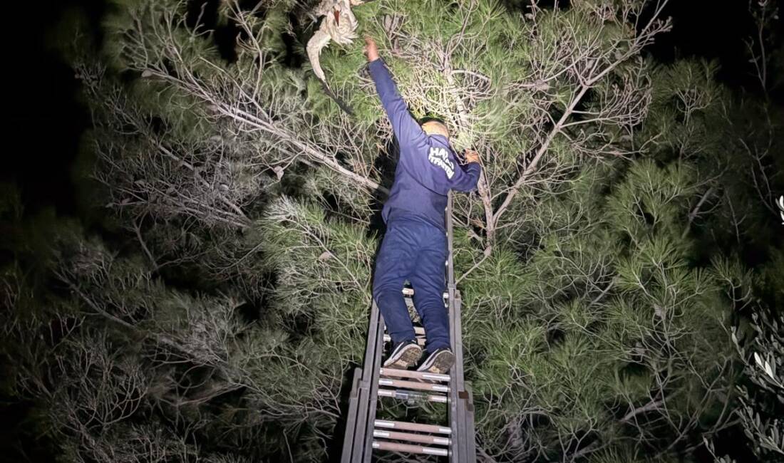 Hatay’ın Belen ilçesinde, çam ağacında ayağına dolanan ip nedeniyle asılı kalan bir leylek, itfaiye ekipleri tarafından kurtarıldı.
