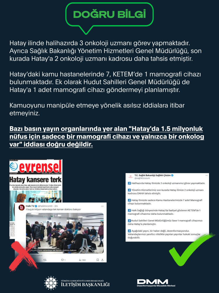 Hatay ilinde bazı basın yayın organlarında, “1.5 milyonluk nüfus için yalnızca bir mamografi cihazı ve bir onkolog bulunuyor” şeklindeki iddialara ilişkin, İletişim Başkanlığı tarafından bir açıklama yapıldı. Bu açıklamada, söz konusu iddiaların gerçek dışı olduğu vurgulandı. Dezenformasyonla Mücadele Merkezi tarafından yapılan yazılı açıklamada, Hatay’daki sağlık altyapısına dair net bilgiler paylaşıldı.