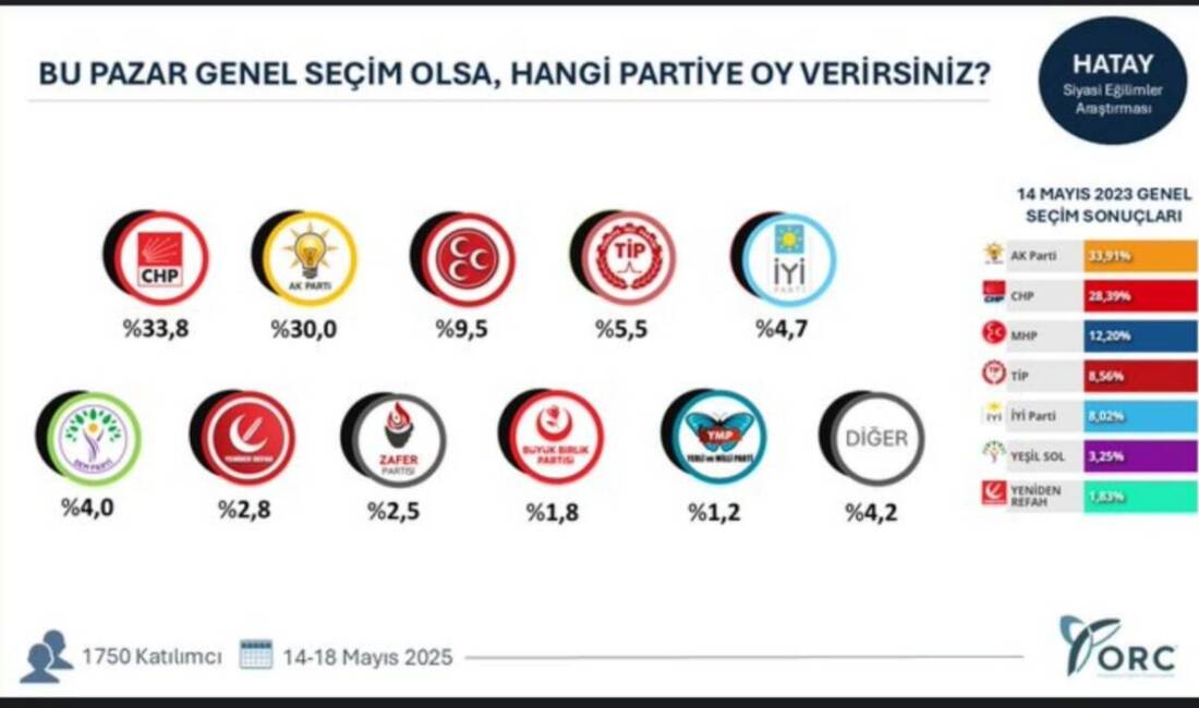 ORC Araştırma’nın 14-18 Mayıs 2025 tarihleri arasında Hatay’da gerçekleştirdiği “Bu pazar genel seçim olsa hangi partiye oy verirsiniz?” başlıklı anket çalışmasının sonuçları açıklandı. 1750 katılımcıyla yapılan araştırmada, CHP %33,8 oy oranıyla birinci parti olarak öne çıktı.
