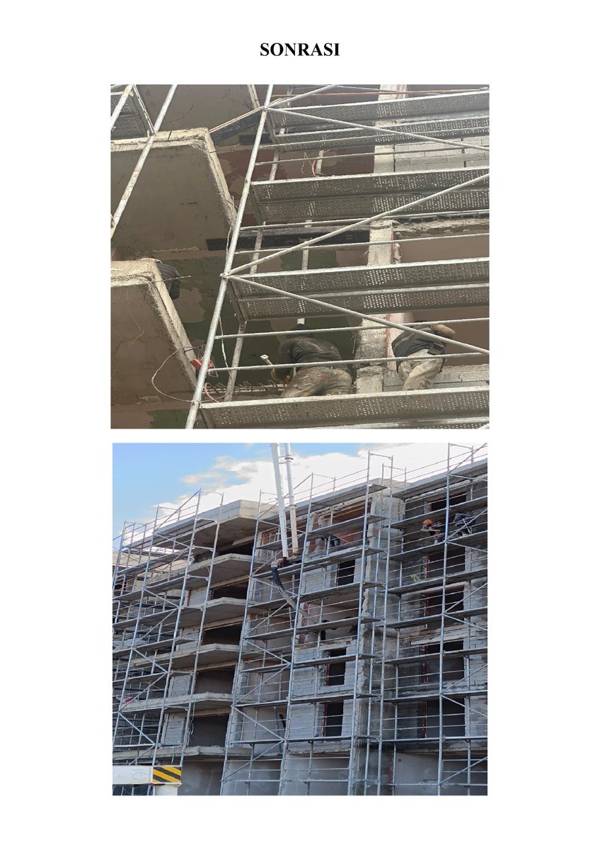 İlgili blokta, 20 Şubat 2025 tarihinde yapılan inceleme sonucunda tesisat boşluğu nedeniyle beton döşemede kırılmalar olduğu ancak taşıyıcı bant filizlerinin kesilmediği ifade edildi. Güçlendirme çalışmaları kapsamında, teknik şartnamelere uygun olarak epoksi ile filiz ekleme ve yüksek mukavemetli beton dökme işlemleri gerçekleştirildi.