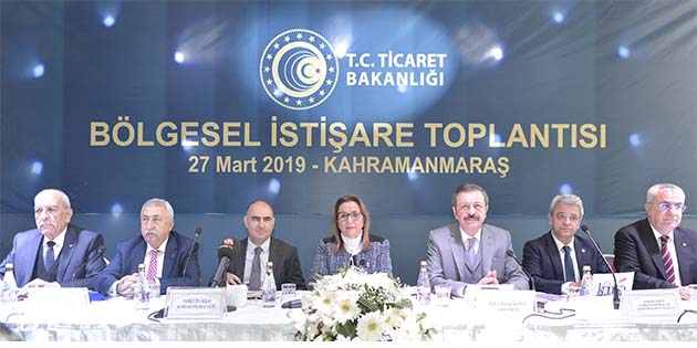 Bölgesel İstişare Toplantısı; Ticaret Bakanı Ruhsar Pekcan, TOBB Başkanı M. Rifat Hisarcıklıoğlu, TESK Başkanı Bendevi Palandöken, Kahramanmaraş Valimiz Vahdettin Özkan, Kahramanmaraş Ticaret ve Sanayi Odası Başkanı Serdar Zabun, Kahramanmaraş Ticaret Borsası Başkanı Ahmet Duran Balsuyu ile Hatay, Afşin, Elbistan, Adıyaman, Gaziantep, Osmaniye, Kilis ve Şanlıurfa’dan Oda ve Borsaların katılımıyla, Kahramanmaraş Ticaret ve Sanayi Odası’nda gerçekleştirildi.