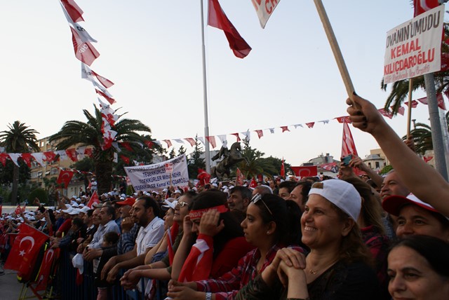 Ve sizlere söz veriyorum, Cumhuriyet Halk Partisi iktidarında Ortadoğu’yu bir barış denizine döndürmek bizim görevimiz olacaktır, bizim namus borcumuz olacaktır. Kinle yapmayacağız, öfkeyle yapmayacağız, insan sevgisiyle yapacağız bütün bunların tamamını. Egemen güçler elimize silah verirse kabul etmeyeceğiz. Birisi diyor ‘Akdeniz’den atacağım yeni geliştirdiğim bombaları’, öbürü diyor ki ‘Hazar Denizinden atacağım yeni geliştirdiğim bombaları.’ Nerede deniyorlar? İslam dünyasında deniyorlar. Nerede deniyorlar? Suriye’de deniyorlar. Ne diyorlardı? ‘Irak’ta nükleer silah var’ diyorlardı. Binlerce Iraklı öldü. Şimdi ‘Suriye’de kimyasal silah var’ diyorlar tıpkı Irak’ta söyledikleri gibi. İspat ettin mi? Dedim kardeşim kimyasal silah kullanmak suçtur, eyvallah. Kim kimyasal silah kullanıyorsa cezalandırılsın, eyvallah. Ama önce bunu tespit edeceksin, kim kullandı ve bu kimyasal silahlar nerede üretildi? Bunu tespit etmek kolay; Birleşmiş Milletlerden bir teknik heyet gelir, oturur araştırır ve ondan sonra gereği yapılır. Araştırmadan, sormadan ‘efendim ben geliştirdiğim yeni silahları deneyeceğim, ülkeler üzerinde deneyeceğim, Suriye üzerinde deneyeceğim, Irak üzerinde deneyeceğim’ derseniz egemen güçlerin paylaşım savaşı Ortadoğu’da yaşanır. Vekalet savaşları Ortadoğu’da yaşanır. Bedeli kim öder? Oradaki Araplar öder, oradaki Kürtler öder, oradaki Ezidiler öder. Kim onlar? Onlar bizim akrabamız. Bizim akrabamız değil mi? Oradaki Araplarla burada yaşayan Araplar bizim akrabamız değil mi? Orada yaşayan Kürtlerle, burada yaşayan Kürtler bizim akrabamız değil mi, kız alıp vermiyor muyuz, düğün dernek yapmıyor muyuz?. Kimsenin etnik kimliğini, kimsenin inancını, kimsenin yaşam tarzını siyasete malzeme etmem. Benim için insan şudur, insan Allah’ın yarattığı en değerli varlıktır ve benim başımın üstünde yeri vardır nokta. İnsan budur.”