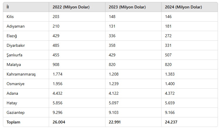 İhracatını arttıran iller arasında Gaziantep, Hatay, Adana, Osmaniye, Kahramanmaraş ve Şanlıurfa öne çıktı. Ancak, Kilis, Elazığ ve Diyarbakır’ın ihracatında düşüşler yaşandı. Kilis’in dış satımı 146 milyon dolara, Elazığ’ın 272 milyon dolara ve Diyarbakır’ın 331 milyon dolara geriledi. Malatya’nın ihracatı ise 2023’te yüzde 9,7 oranında bir azalışla 820 milyon dolar seviyesine indi ve 2024’te değişim göstermedi.