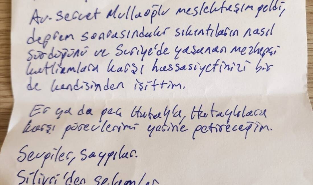 “Pek kıymetli Hataylı hemşehrilerim, meslektaşım Av. Servet Mullaoğlu’nun ziyareti beni çok mutlu etti. Deprem sonrasındaki sıkıntıların hâlen sürdüğünü, Suriye’deki mezhepçi katliamların sizlerde yarattığı hassasiyeti bir de ondan dinledim. Er ya da geç Hatay’a ve Hataylılara karşı görevlerimi yerine getireceğim. Silivri’den selamlar.”