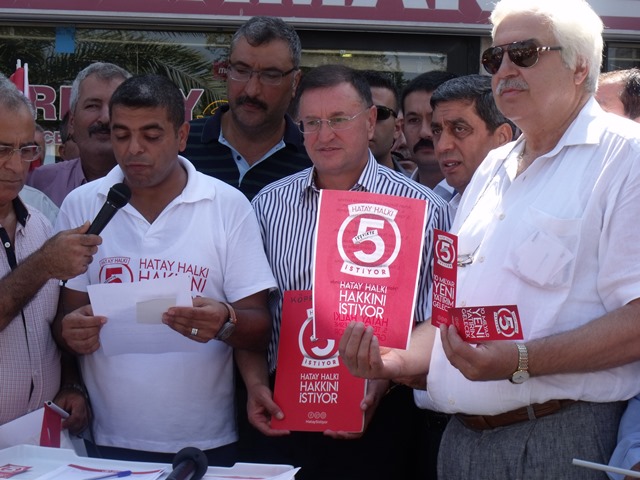 Akdeniz Muhtarlar Federasyonu Başkanı Mahmut Gülcü ve ilimizin dört bir tarafından gelen Muhtarlar dün Antakya’da Ulus Meydanında bir araya geldi, HBB Başkanı Doç.Dr. Lütfü Savaş’ın başlattığı” Hatay Halkı Hakkını İstiyor” kampanyasına tam destek verdiklerini açıkladı ve Hatay’ın kazanması için imza atacaklarını vurguladı.