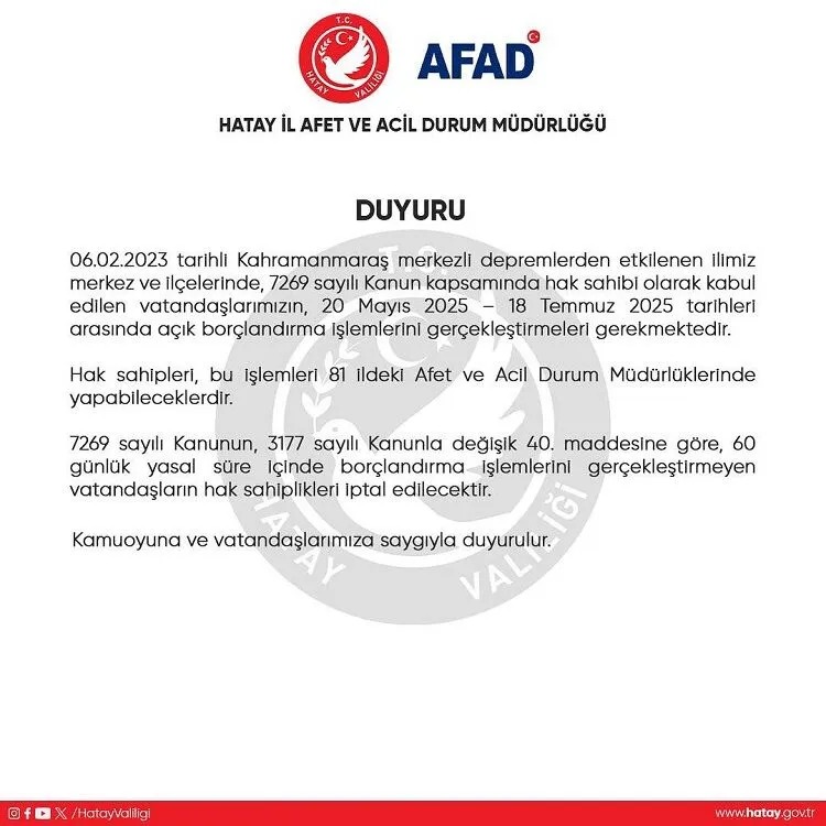 Hatay İl Afet ve Acil Durum Müdürlüğü, 7269 sayılı Kanun’un 40. maddesi doğrultusunda başlatılan borçlandırma işlemleri için önemli bir hatırlatma yaptı. Açıklamaya göre, belirtilen tarihler arasında borçlanma yapmayanların hak sahipliği iptal edilecek.