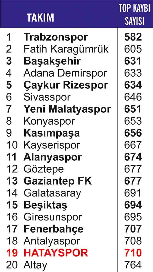 Süper Lig’de, 7. Hafta maçlarıyla birlikte birçok veri güncellendi. Son oynanan karşılaşmaların ardından, ilk 7 hafta göz önünde bulundurulduğunda en az top kaybı yapan takımlar sıralandı. En az top kaybı yapan takımlarda ilk 3’ü Trabzonspor (582), Karagümrük (605) ve Başakşehir (631) alırken, Hatayspor bu alanda 710 top kaybı yaparak, 20 takım arasında 19. sırada yer aldı. İşte Süper Lig’deki takımların top kaybı tablosu: