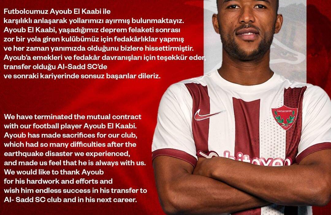29 Yaşındaki Faslı Milli Futbolcu Ayoub El Kaabi ile Hatayspor karşılıklı anlaşarak yolları ayırdı. Forvet oyuncusu El Kaabi Al Sadd SC kulübüne transfer oldu.